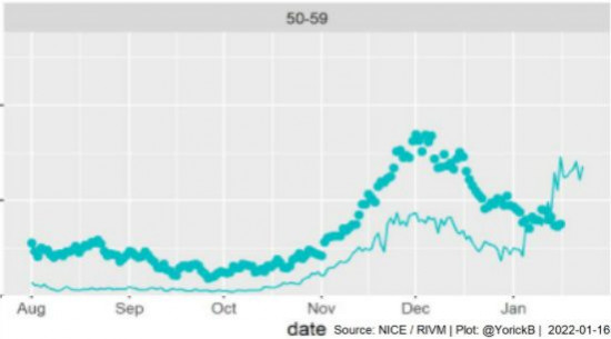 Het aantal 50-59 jarigen die de afgelopen dagen zijn opgenomen in de ziekenhuizen is 18 per dag. Dat is dus 0,45% van de positieve gevallen en een factor drie keer zo klein als tijdens de Delta periode. Op de IC's zijn het er nu 4 per dag en dat is 0,01%. Een factor 5 keer zo weinig als tijdens de Delta periode.