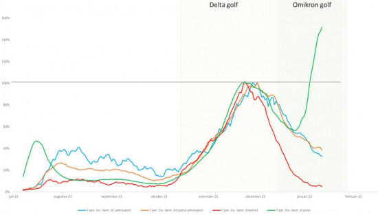 Deze grafiek laat nog sterker zien dan in Engeland hoe de ziekenhuis- en IC-opnames nog steeds dalen terwijl het aantal positieve testen sterk stijgt. Sinds ongeveer Kerst zijn de positieve testen met een factor van meer dan 2,5 gestegen, terwijl de ziekenhuis- en IC-opnames in die periode zijn gehalveerd.